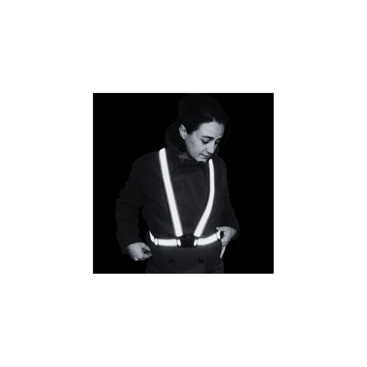 Composición: elástico (60% poliéster, 40% elastán) / cinta reflectante de 2 cm (41% microperlas aluminizadas, 26% capa adhesiva, 33% soporte) / piezas de ajuste y fijación de plástico negro.