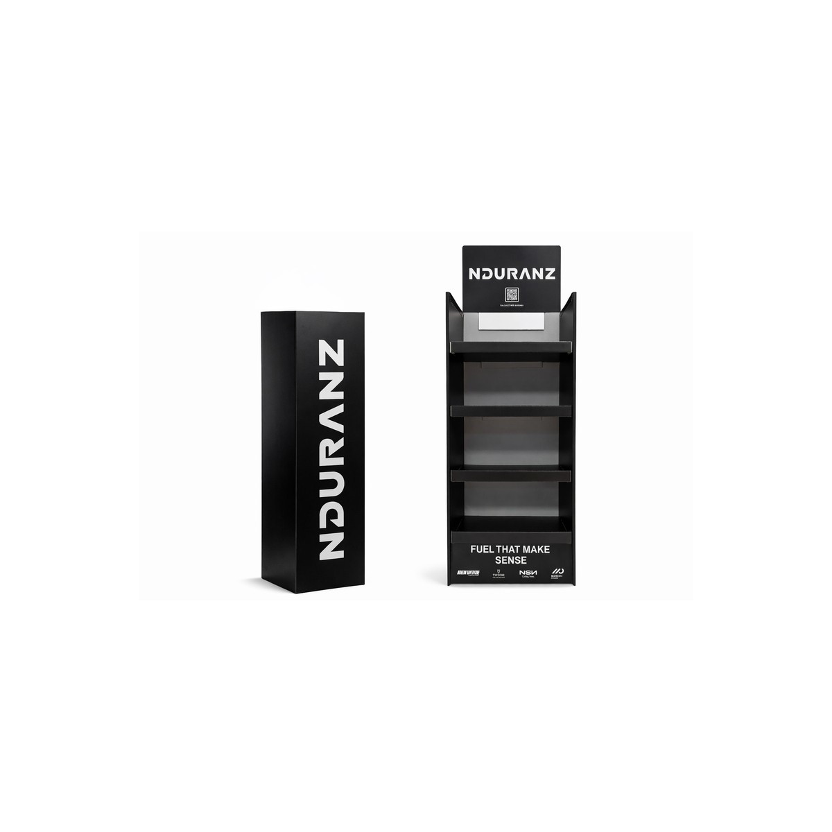 Maximice la visibilidad de los productos NDURANZ en su punto de venta con este expositor de suelo dedicado a la nutrición deportiva.