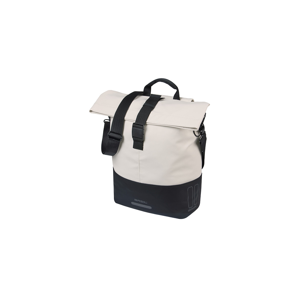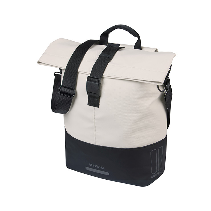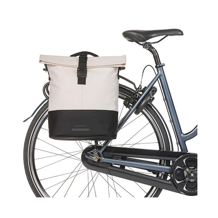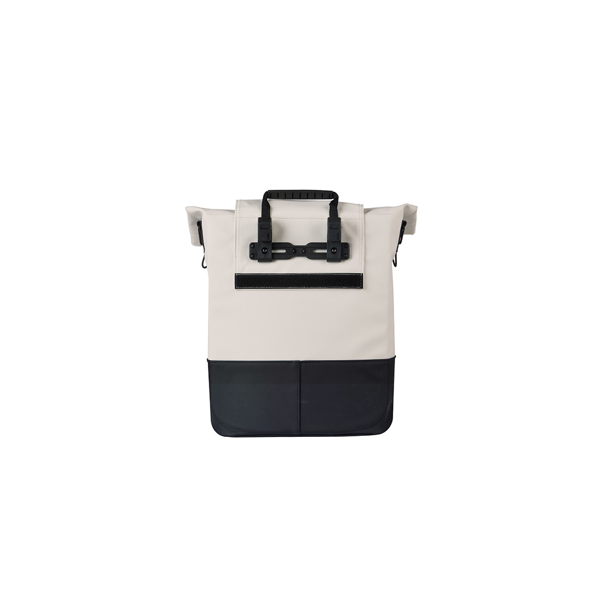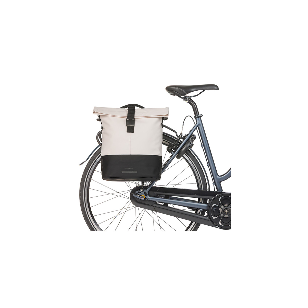 La bolsa Basil Cove en blanco roto/negro es una bolsa para bicicleta elegante y atemporal con una capacidad de 14 a 16 litros, que incorpora ganchos MIK.