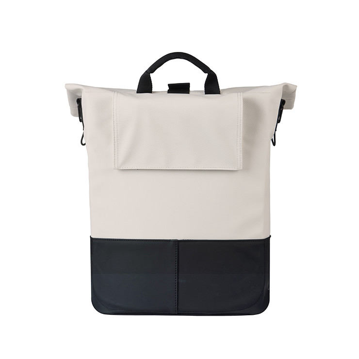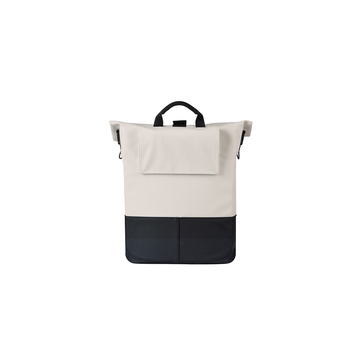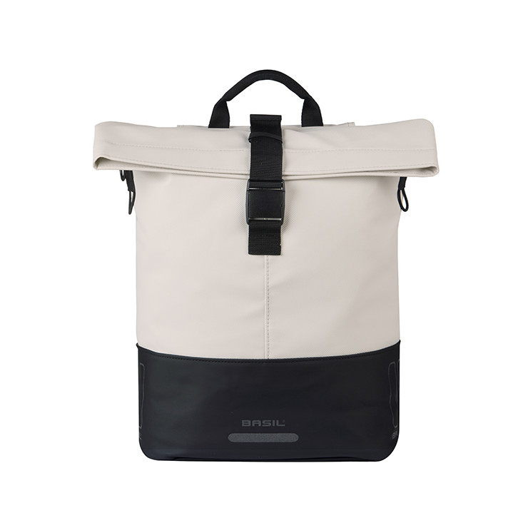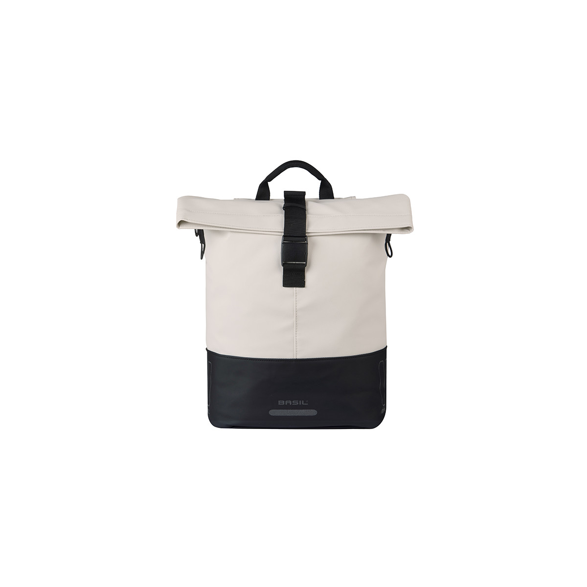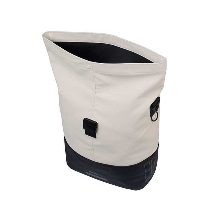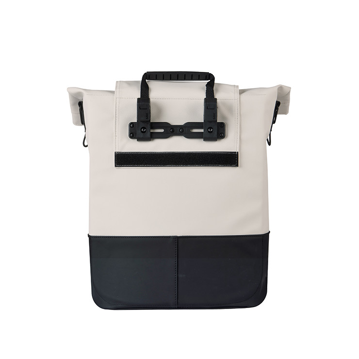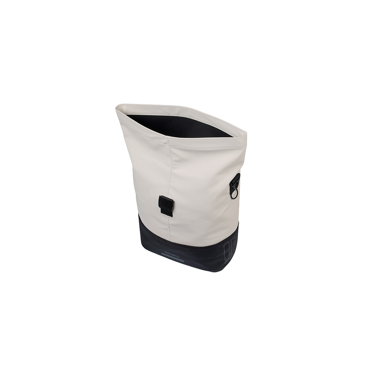 La bolsa Basil Cove en blanco roto/negro es una bolsa para bicicleta elegante y atemporal con una capacidad de 14 a 16 litros, que incorpora ganchos MIK.