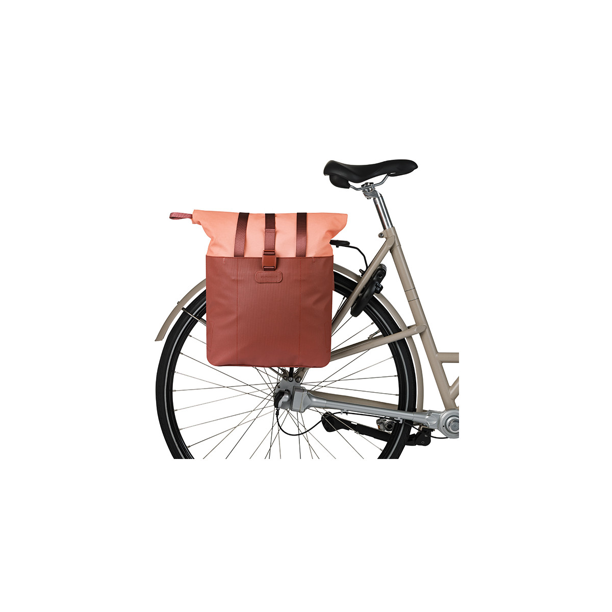 La bolsa para bicicleta Basil Vive es una bolsa elegante y práctica con una capacidad de 15 a 20 litros, equipada con ganchos MIK.