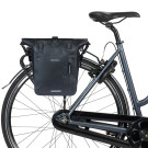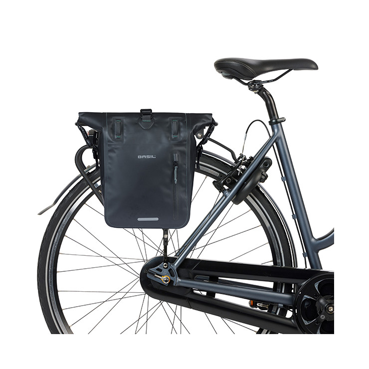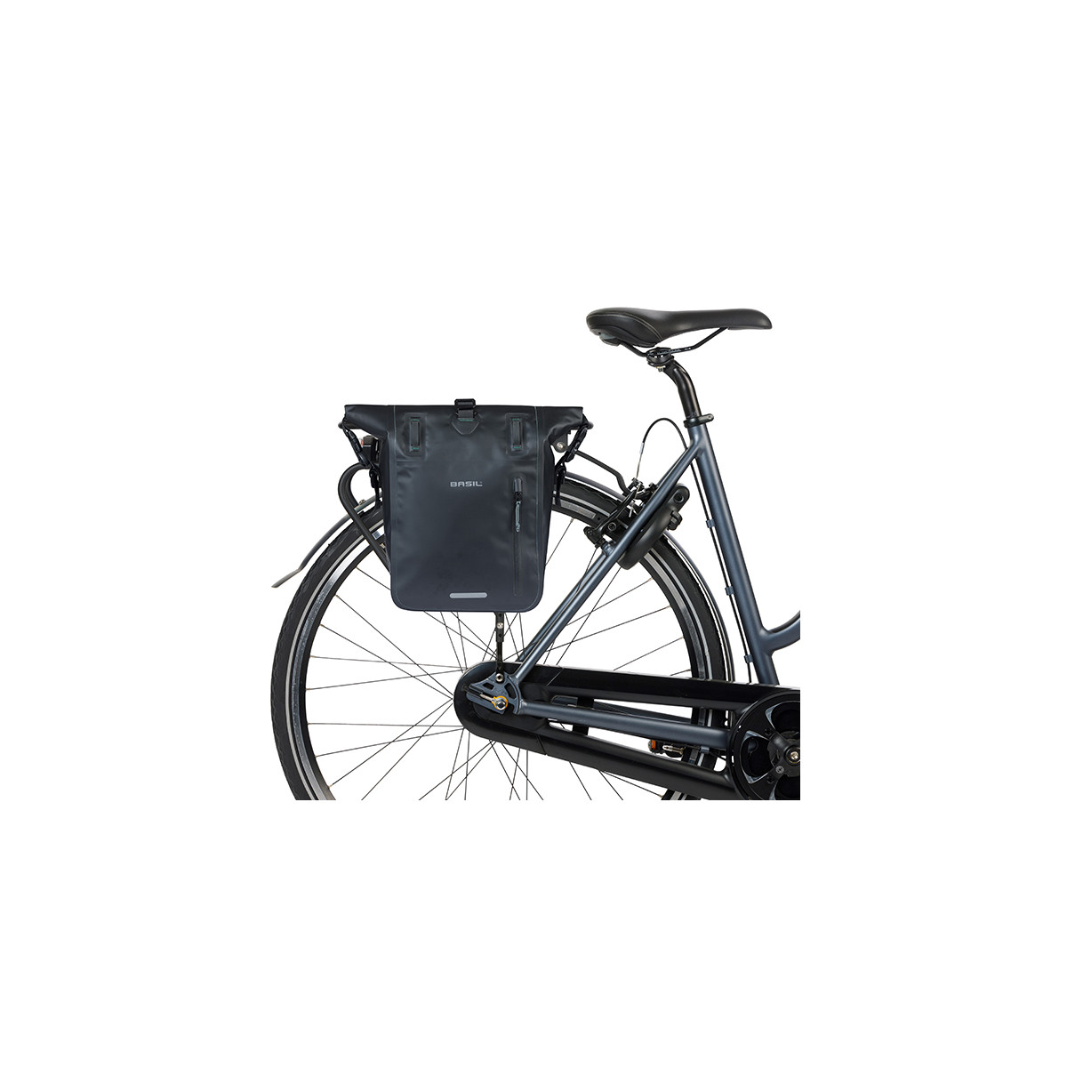 La Basil Rivo M es una bolsa de bicicleta deportiva e impermeable con una capacidad de 12 a 15 litros, equipada con ganchos MIK.