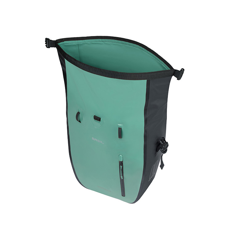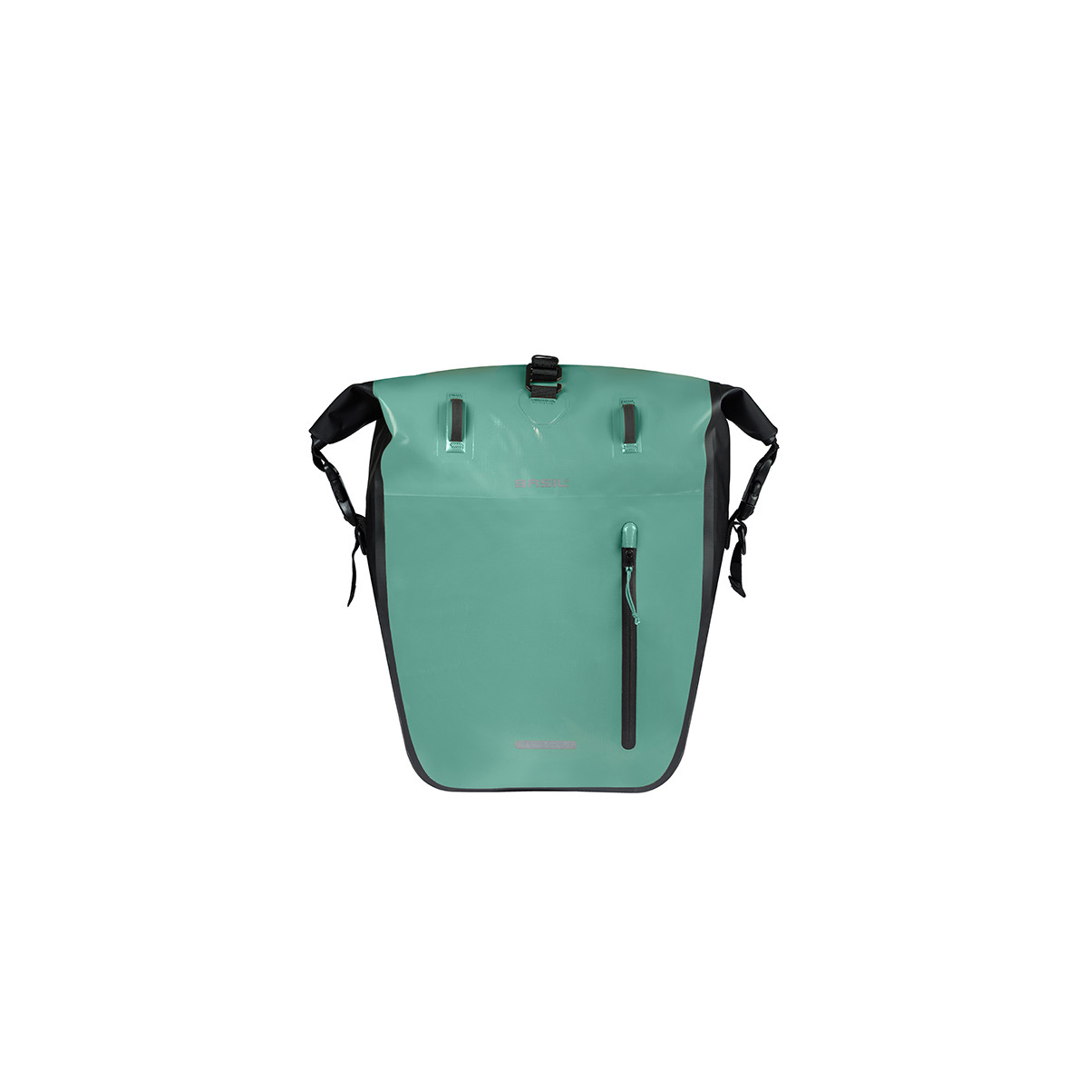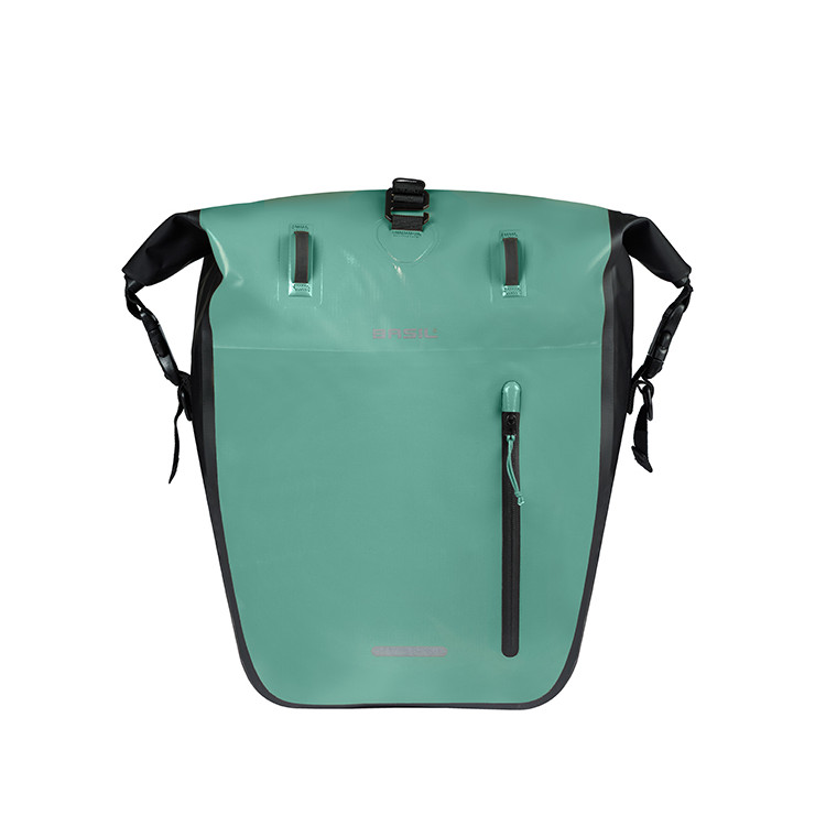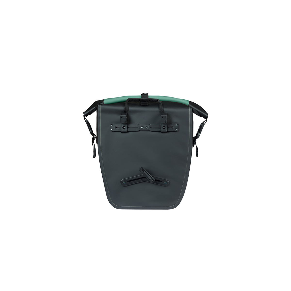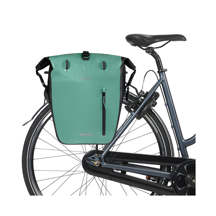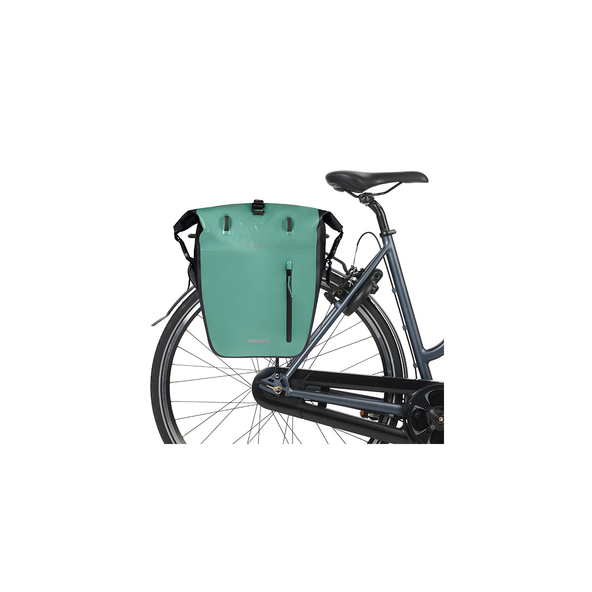 La Basil Rivo L es una bolsa para bicicleta robusta e impermeable con una capacidad de 25-31 litros, equipada con ganchos MIK.
