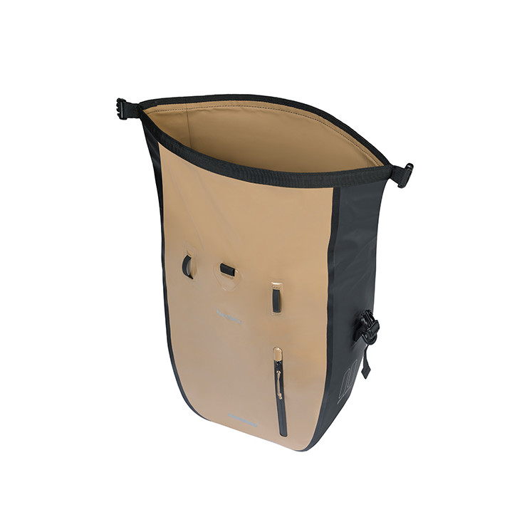 La Basil Rivo L es una bolsa para bicicleta robusta e impermeable con una capacidad de 25-31 litros, equipada con ganchos MIK.