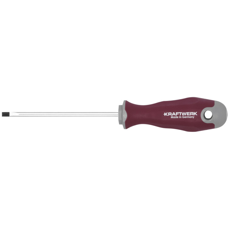 PRO LINE Destornillador plano - MADE IN GERMANY - Mango ergonómico de gel/elastómero, diseñado para adaptarse a la forma de la mano - Mango multicomponente - Agarre suave, liso y sin costuras para un máximo confort y una mínima fricción - Mango con diseño antideslizante - Orificio en la cabeza del destornillador - Símbolos de tornillo en la cabeza del destornillador.