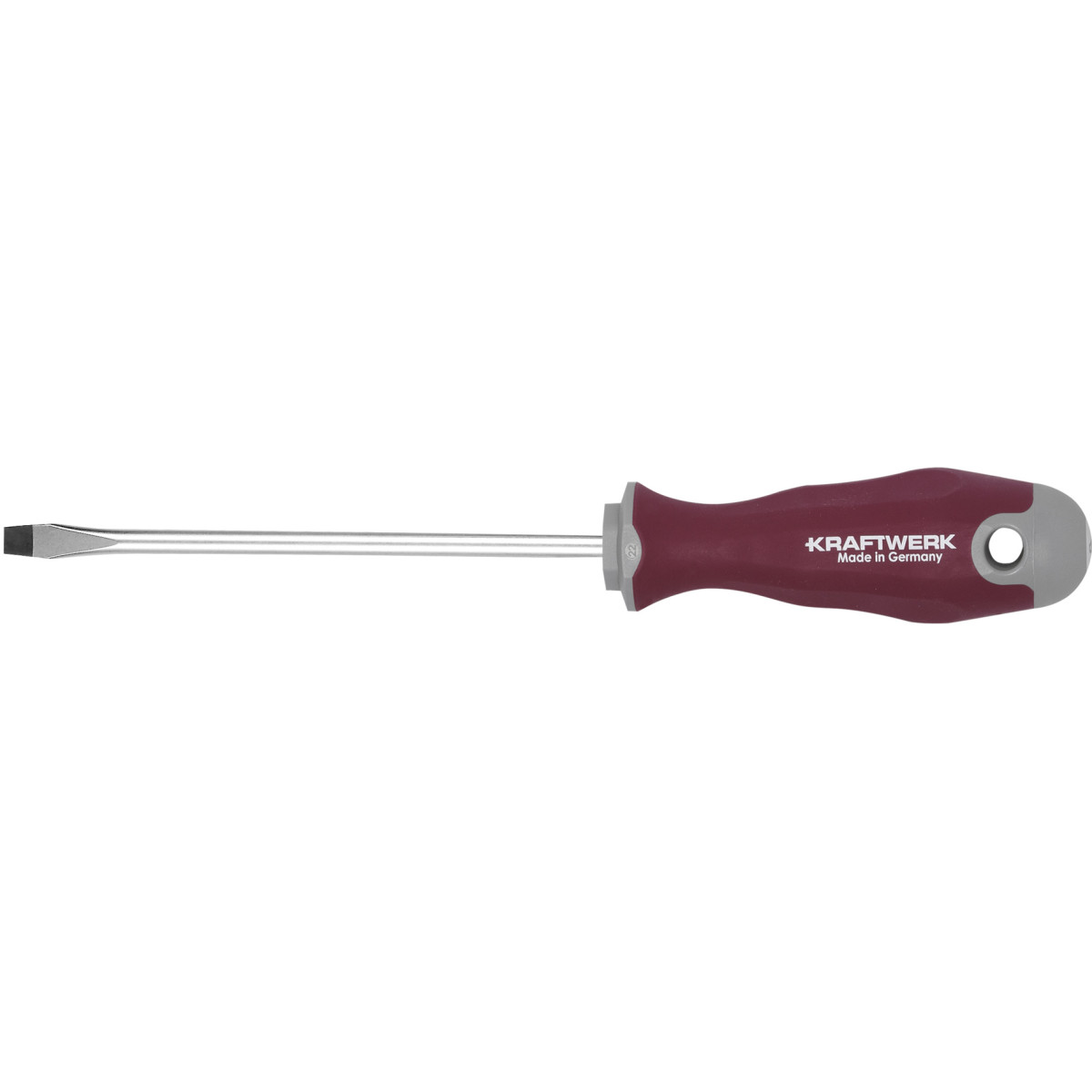 PRO LINE Destornillador plano - MADE IN GERMANY - Mango ergonómico de gel/elastómero, diseñado para adaptarse a la forma de la mano - Mango multicomponente - Agarre suave, liso y sin costuras para un máximo confort y una mínima fricción - Mango con diseño antideslizante - Orificio en la cabeza del destornillador - Símbolos de tornillo en la cabeza del destornillador.