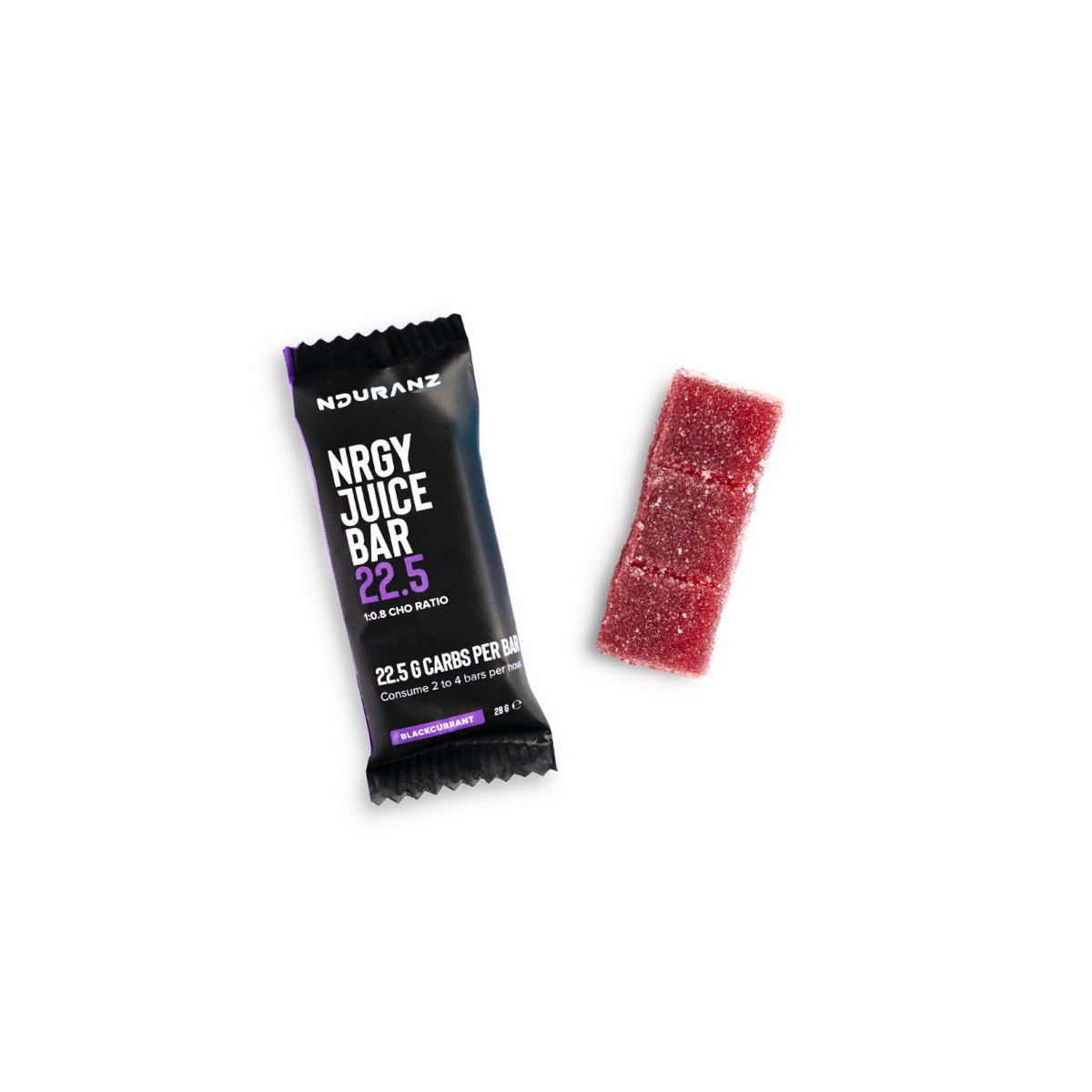 Nrgy Juice Bar 22.5 está formulado según la proporción de hidratos de carbono de Nduranz, con una proporción de 1:0,8 entre glucosa (maltodextrina) y fructosa.