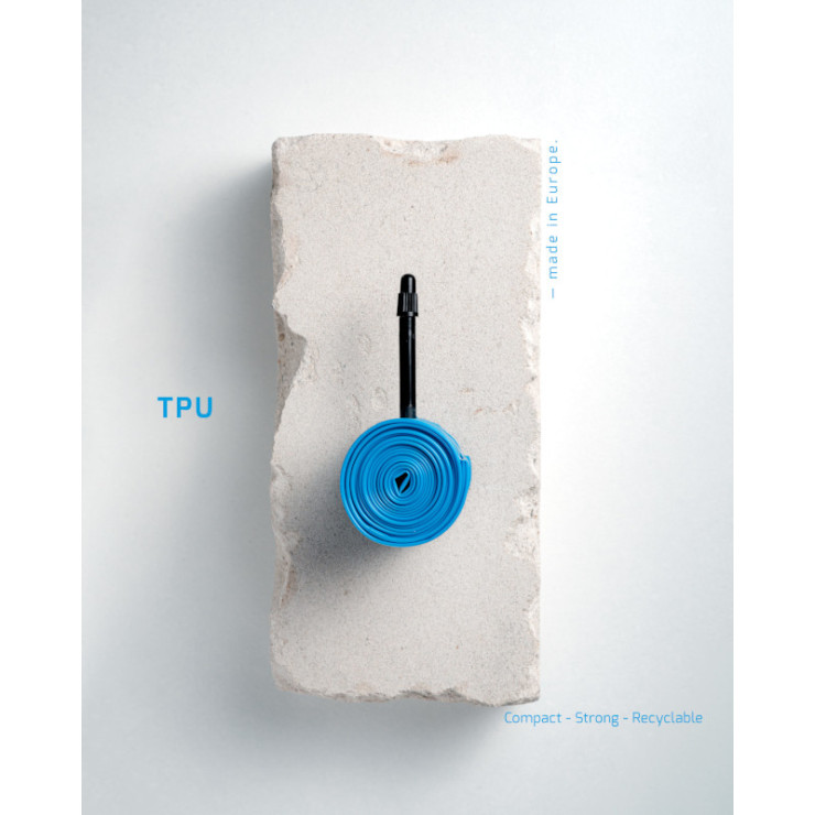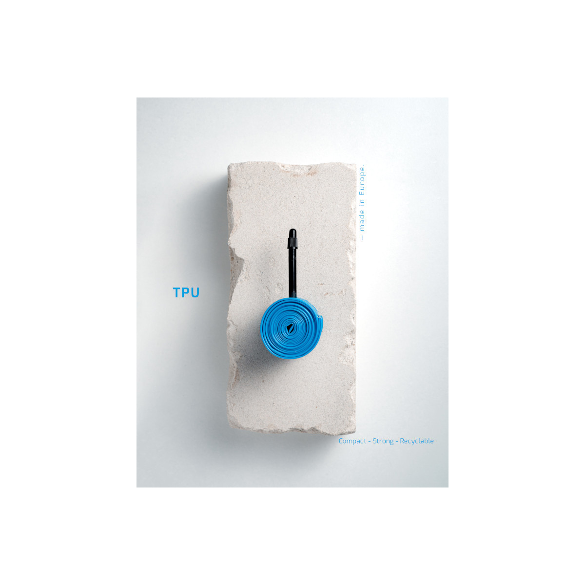 Cámara de aire de TPU para bicicletas de montaña. Resistente a los pinchazos, duplica la protección de las cámaras de butilo estándar de 200 g. Ligera, duradera y fácil de guardar. Máximo rendimiento sin volumen. Talla única. Válvula Presta/SV.