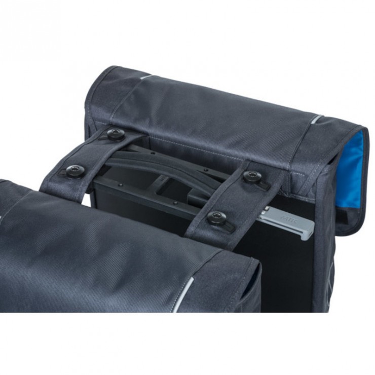 A Basil Sport Design Double MIK é uma mala dupla moderna. O saco é fabricado em poliéster de alta qualidade e resistente à água. O forro interior é de uma atraente cor azul. Graças à sua disposição bem pensada, pode levar consigo as suas compras ou outros objectos. O saco está equipado com alças elásticas para garrafas. O saco tem uma placa adaptadora MIK pré-montada (70171). Graças a esta placa, pode fixar facilmente o saco num suporte do sistema MIK ou se não tiver um (vendido separadamente). E com a mesma facilidade, pode retirar o saco duplo do seu porta-bagagens.