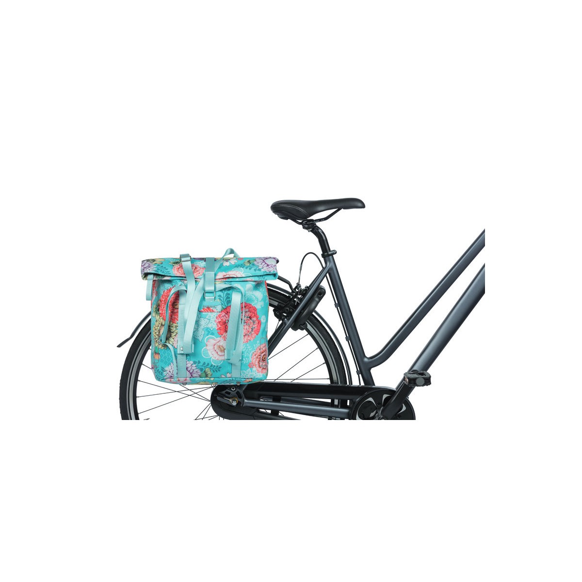 O Basil Bloom Field é um saco para bicicletas com uma capacidade de 15 a 20 litros. O comprador de bicicletas tem um aspeto moderno e alegre numa cor azul-celeste!