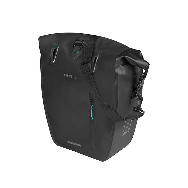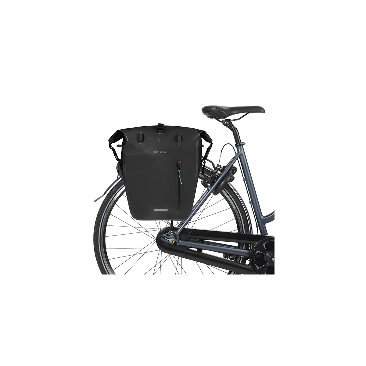 O Basil Rivo L é um saco de bicicleta robusto e impermeável com uma capacidade de 25-31 litros, equipado com ganchos MIK.