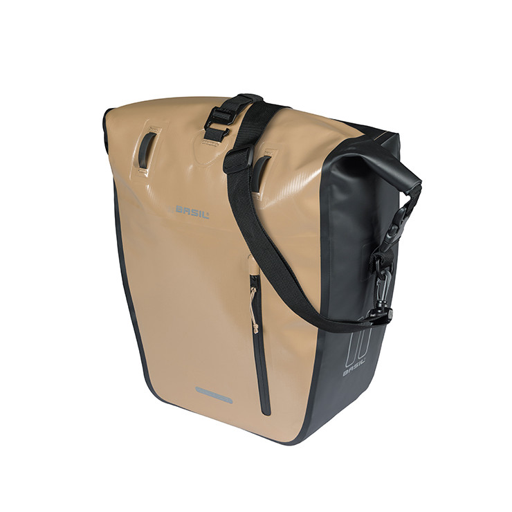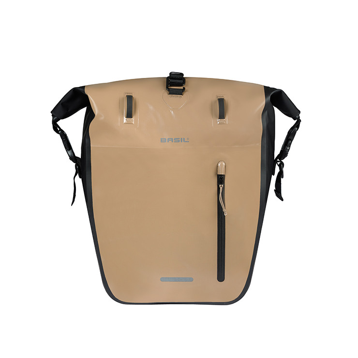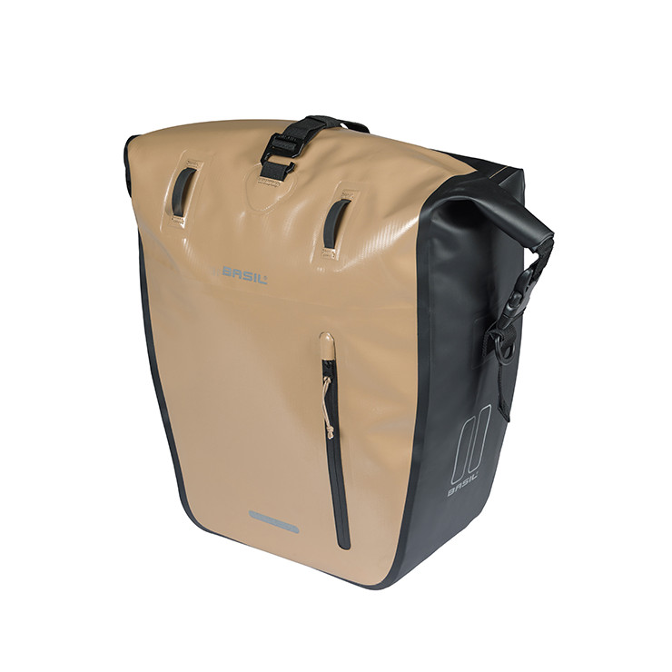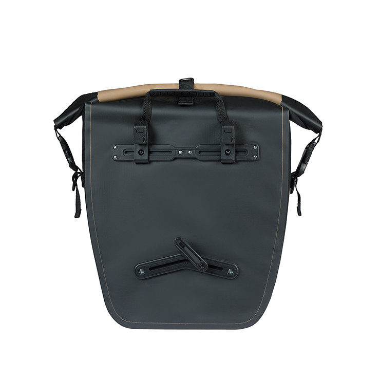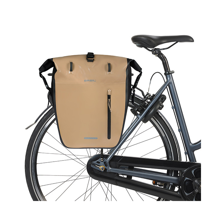 O Basil Rivo L é um saco de bicicleta robusto e impermeável com uma capacidade de 25-31 litros, equipado com ganchos MIK.