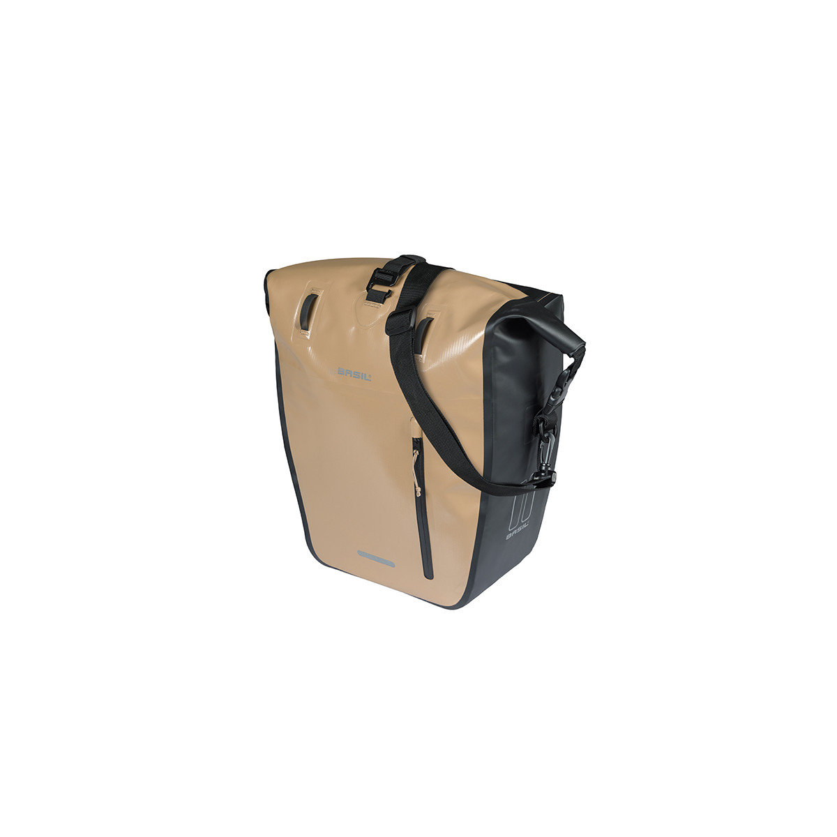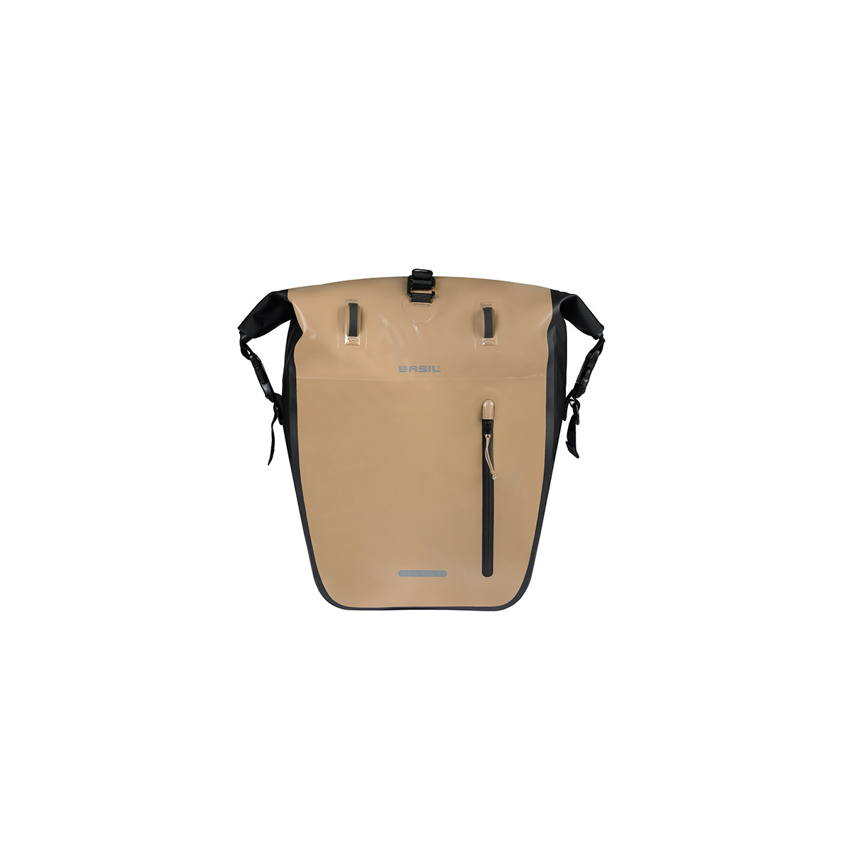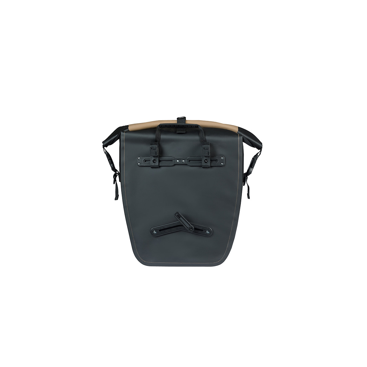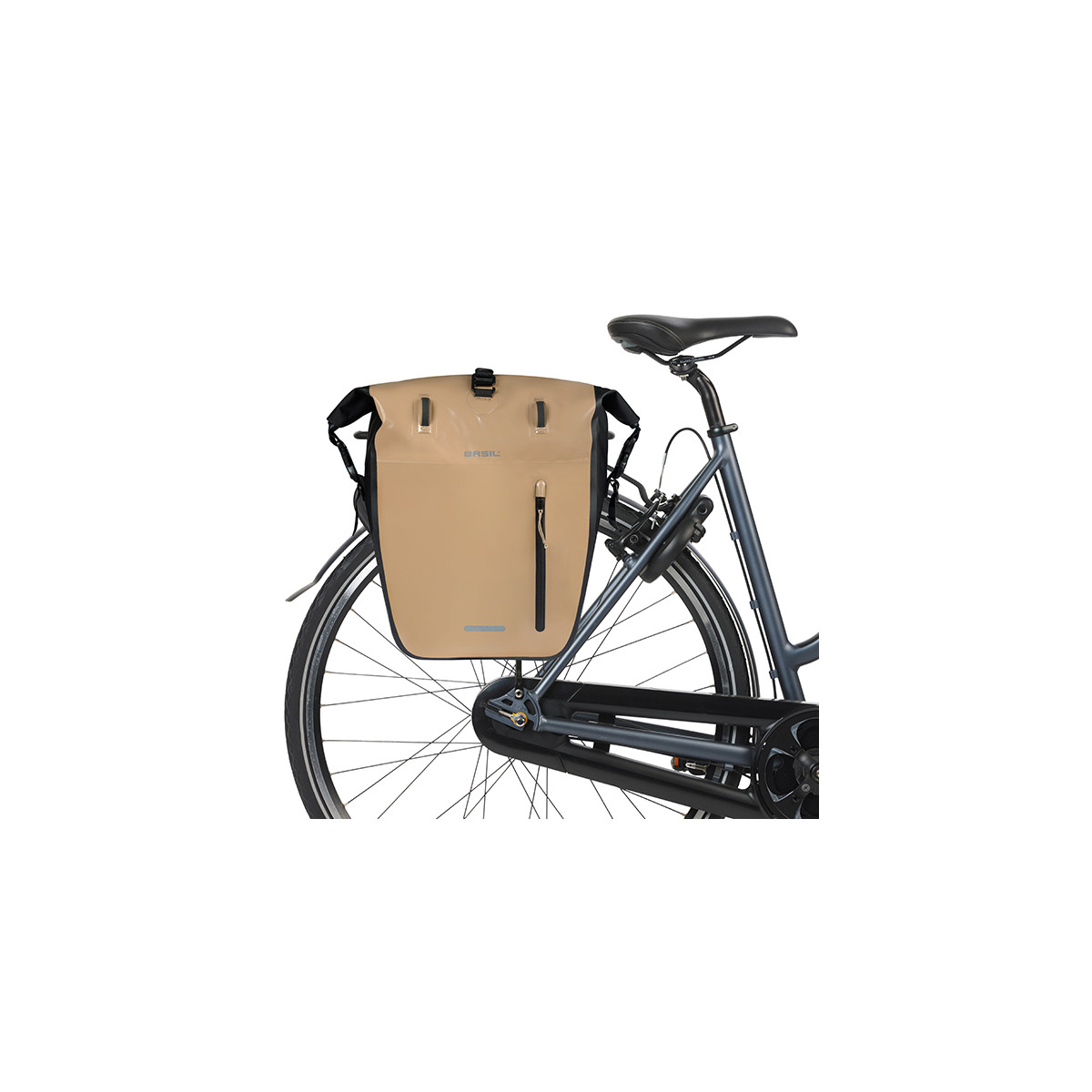 O Basil Rivo L é um saco de bicicleta robusto e impermeável com uma capacidade de 25-31 litros, equipado com ganchos MIK.