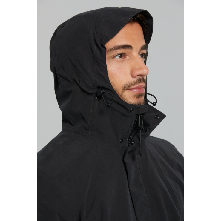 Esta parka de chuva preta não só está na moda graças ao seu corte em cauda de peixe, ao tecido mate e à cor moderna, como também o protege da chuva. A sua composição TFabric 5.000 WP e 5.000 MVP torna o casaco impermeável e respirável. O revestimento DWR garante que a água da chuva não é bloqueada e que o interior do casaco não fica húmido (a transpiração escapa).