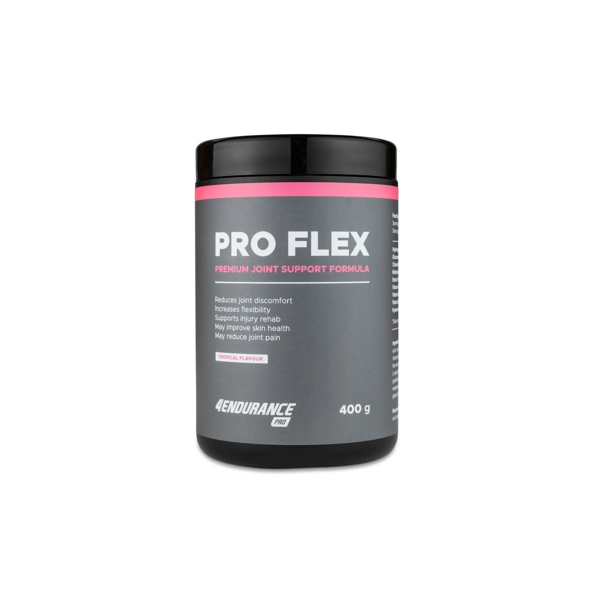 Pro Flex 4Endurance Pro é uma fórmula potente que associa os efeitos do colagénio hidrolisado, do MSM, da boswellia, da glucosamina, da condroitina e do ácido hialurónico.