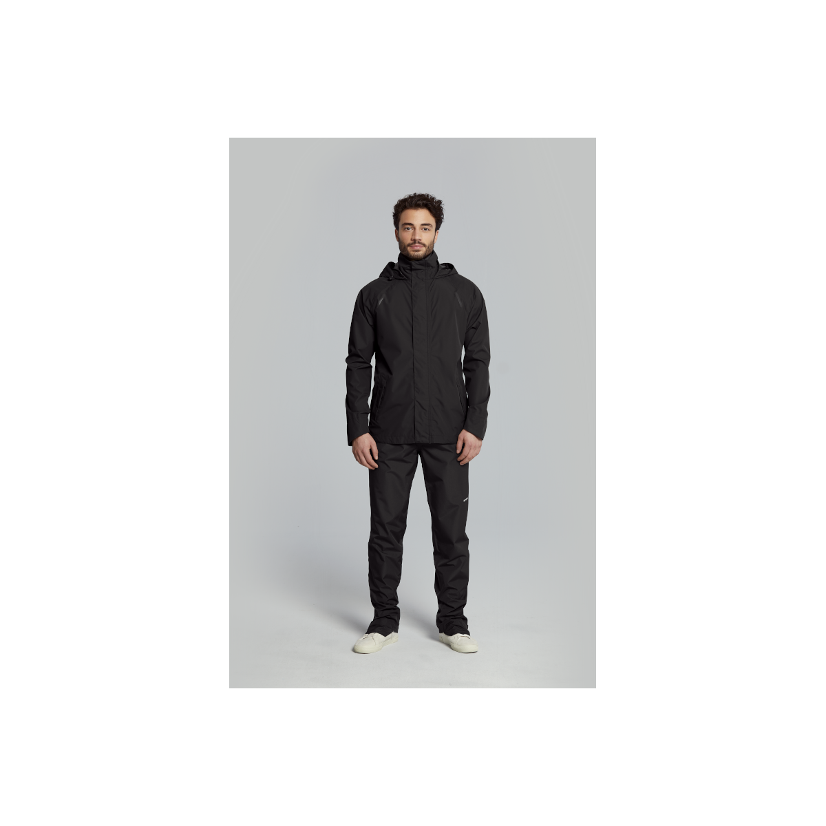 A sua composição reflectora de alta qualidade aumenta a segurança quando se anda de bicicleta de manhã cedo ou à noite. O fato de chuva unissexo em preto é fornecido num saco de arrumação e está disponível nos tamanhos S a XXXL.