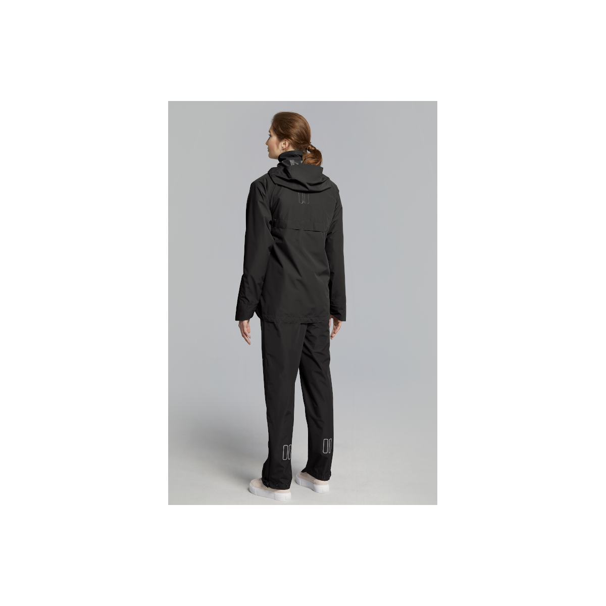 Quando ajusta este capuz de três partes, a sua visão permanece clara. As costas alargadas do casaco garantem que as suas costas permanecem secas mesmo durante passeios intensos. O casaco tem também bolsos laterais e mangas compridas. O fecho de correr de 40 cm de altura facilita a colocação das calças de chuva e a cintura elástica evita que as calças caiam.
