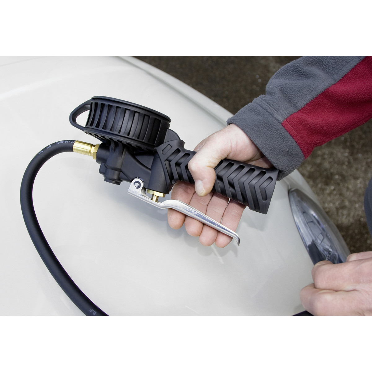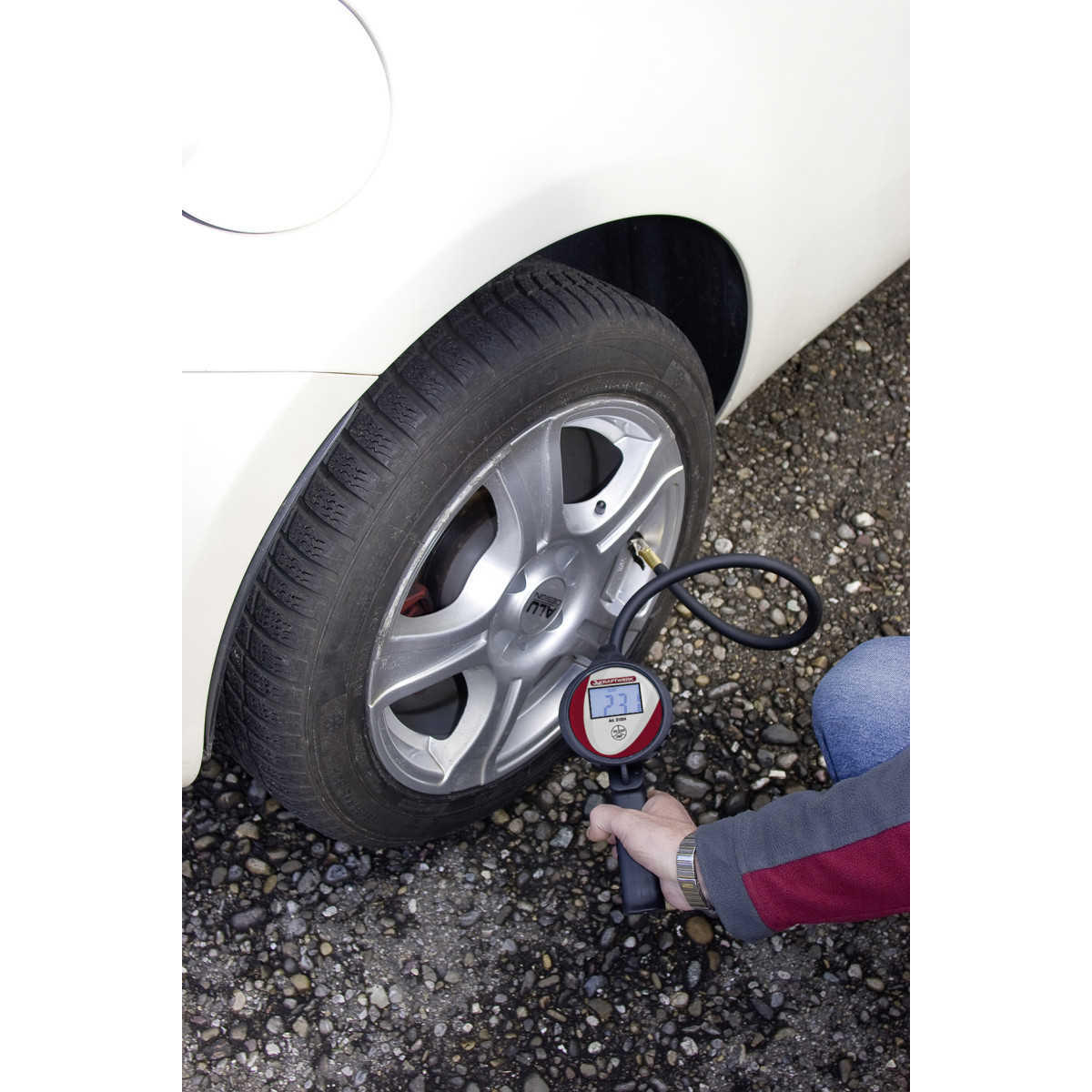 Insuflador de pneus com ecrã digital e luz de fundo. Mede em bar, psi, kpa e kgf, ideal para regular e verificar a pressão do ar. Caixa revestida a borracha. Ligação de 1/4" incluída.