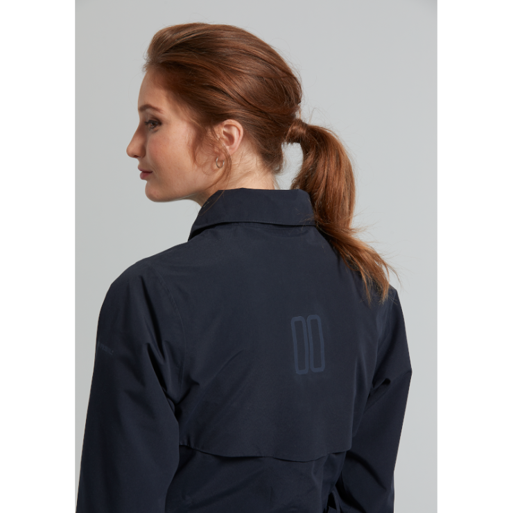 A gabardina tem também um forro de malha e tafetá, bolsos laterais práticos e é ventilada nas costas e à frente. As mangas superiores são alongadas e ajustáveis para um toque agradável e confortável. Uma cintura elástica adicional no interior do casaco garante um ajuste perfeito. O casaco apresenta também um cordão refletor tom sobre tom.